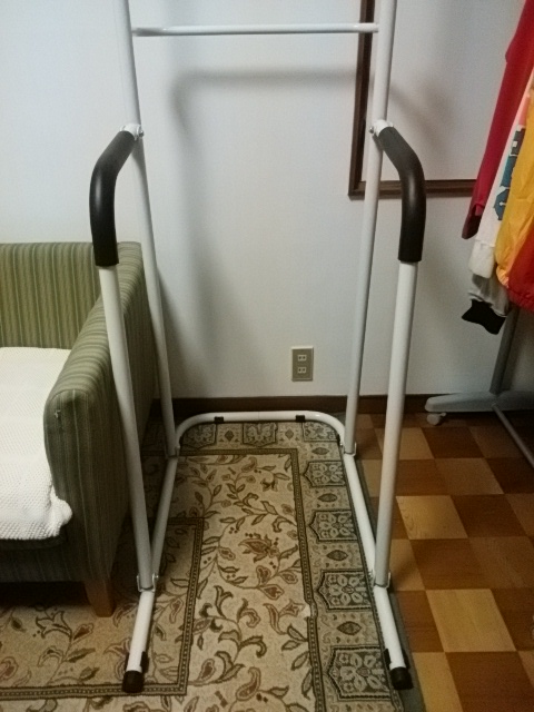 両支柱を前方から支えるタイプで、土台部分が三方向つながって安定しそうなモノ、握る為のバーの端がハの字になっている、というのが選んだ理由です。