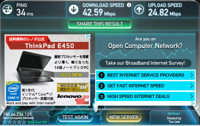 1階から無線LAN+2階中継機の時と比べるとおおむね同じくらいですが、過去には最速で70Mbps近く出たことがあったので、今の環境だと微妙に遅くなっている可能性もあります。