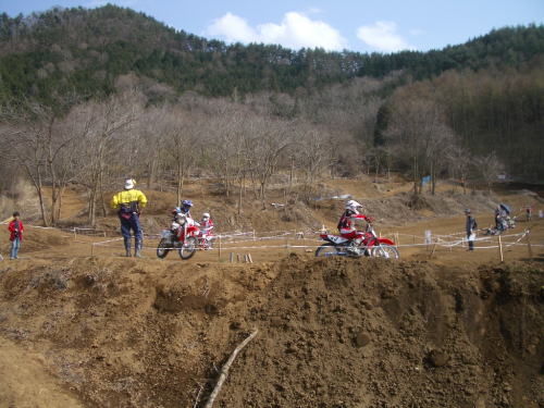 2Hレースの後に、いつもの体験走行を行いました。今回はいつも来てくれるS君とマンツーマンです。様子をみて、モトクロスコースを体験してもらいました。2周先導し、フリーに走ってもらいました。小さいマシンで上りはキツイと思いましたが、開けっぷりが良いS君はガンガン上っていきます。小さなマシンのタイヤが半分埋まりそうなギャップもガツンガツン進んでいきます。大人サイズで考えたら、こりゃえらいことです。それと、走行中に一度も転倒しませんでした。すごいね。下りのS字コーナーではラインをクロスさせて雰囲気を出してみたりして。イン側を空けると差されたりして。こりゃ近々抜かれますね。