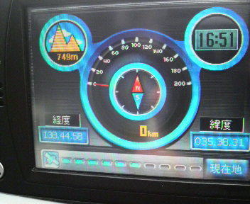 土曜から来るスタッフさん達は現地で寝起きします。なので、昨年から山梨でやっていても4月の開催は今回が初めてなのでどの位寒いのだろう?と思う訳です。前日から参加すると、15~16時位からコース設定(杭を打ったりロープを張ったり)→近場の温泉→近場で夕飯→近場で今夜の宴と朝飯等の買出し→車中泊orテント泊という感じになります。昨年の3回(6月と8月と10月)では夜が意外と冷えましたので、スタッフコートの様なものは必需品です。山の夜は冷えますからね。ちなみに、ナビのGPS機能によると、クロスパーク勝沼の駐車場の標高は749mです。(写真左上)
