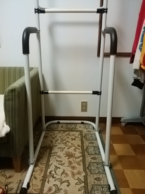 両支柱を前方から支えるタイプで、土台部分が三方向つながって安定しそうなモノ、握る為のバーの端がハの字になっている、というのが選んだ理由です。