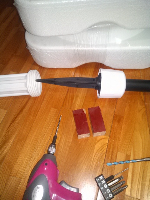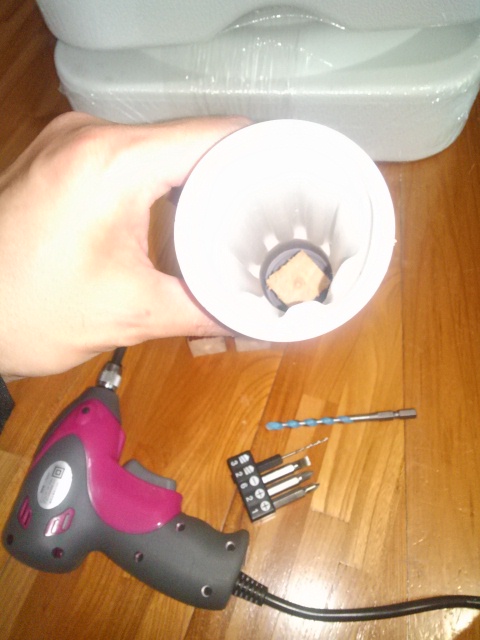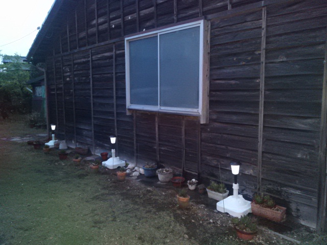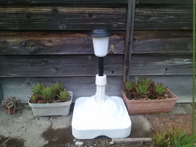 この白いのは、水を入れて重しにして旗竿(お土産とかひものとかの旗)を挿す998円の土台で、これに太陽光で逐電する外灯(ドンキにて処分品¥200)をセットして電気代不要の庭用外灯の出来上がり。木片は外灯の高さ調整で入れた訳です。
