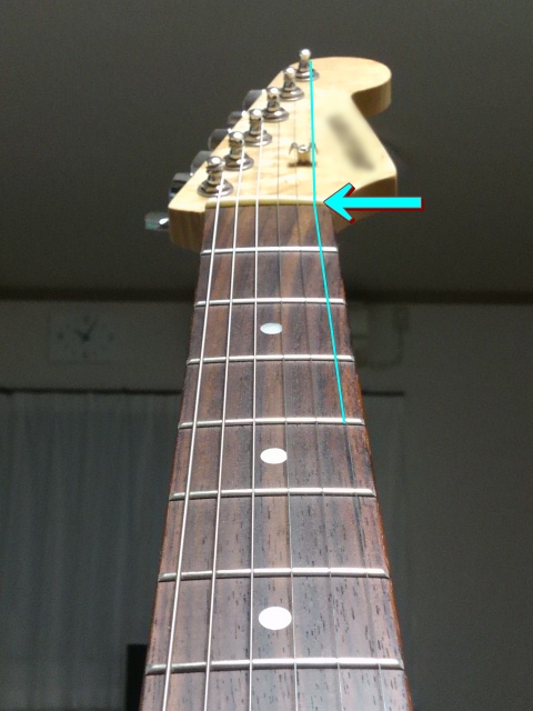 確認の為、スクワイヤなどの価格の安いギターを見てみましたが、ここの部分は真っ直ぐになるようにデザインされていましたので、安いとすべてこんな感じなのかというとそうでもない様です。
