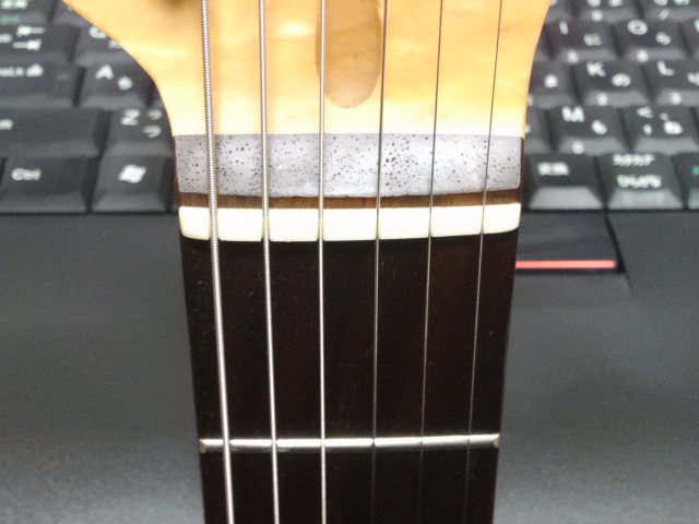これではアームを使った時に、ナットの前後のテンションがバランスできずにチューニングが狂う原因となるでしょう。ちなみに、1弦をガイドとナットから外してみたところ、ナットの外側にきました。