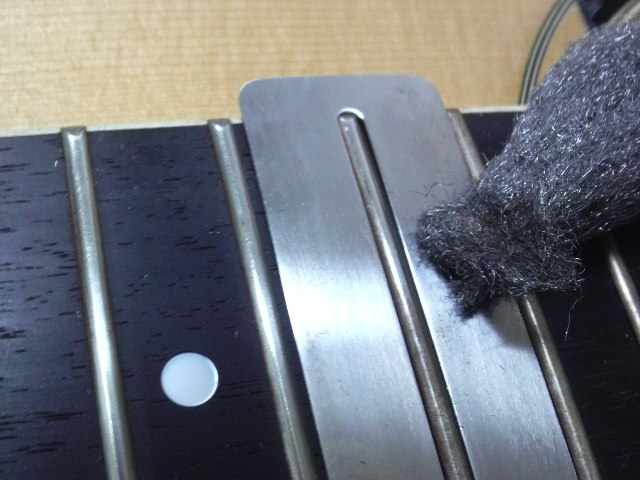 マスキングはせずに、フレット磨き用プレートを当てて磨きます。