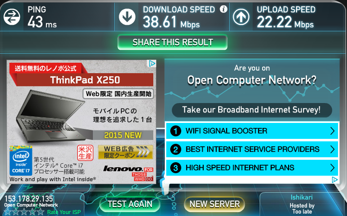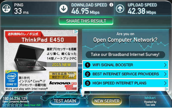 1階から無線LAN+2階中継機の時と比べるとおおむね同じくらいですが、過去には最速で70Mbps近く出たことがあったので、今の環境だと微妙に遅くなっている可能性もあります。