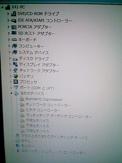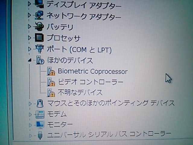 BIO(バイオ)なんちゃらは指紋承認か?とりあえず無視。不明なデバイスも無視。問題はビデオコントローラー。これが正常に動かないとどうなるか?サスペンドが使えません。Fn+F4でサスペンドさせようとしても、30秒ほどかけてシステムの休止状態になってしまい、復帰には電源ボタンから復帰させないといけません。サスペンドが使えないと、お仕事中にパネルを閉じて部屋を移動する・・・なんて時に、立ち上がるのを待っている・・・なんてスムーズじゃないし。まぁ。この状態でも使えないことはないです。結構動きます。
